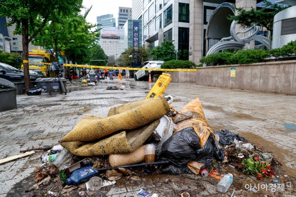 서울을 비롯한 중부지역에 기록적인 폭우가 내린 9일 서울 서초구 강남역 인근 건물에서 침수피해 복구작업이 진행되고 있다./강진형 기자aymsdream@