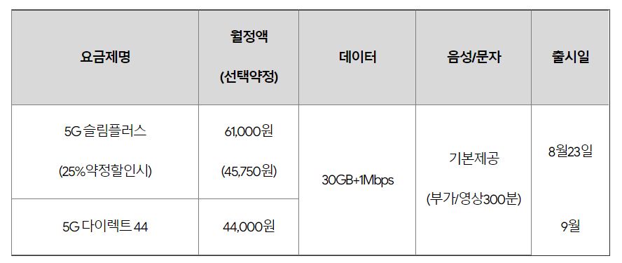 KT가 신고한 5G 중간 요금제 '5G 슬림플러스'는 월 6만1000원에 30GB 데이터를 제공하며, 소진 시 1Mbps 속도로 데이터를 이용할 수 있는 상품이다. 해당 요금제는 이달 23일 공식 출시된다.