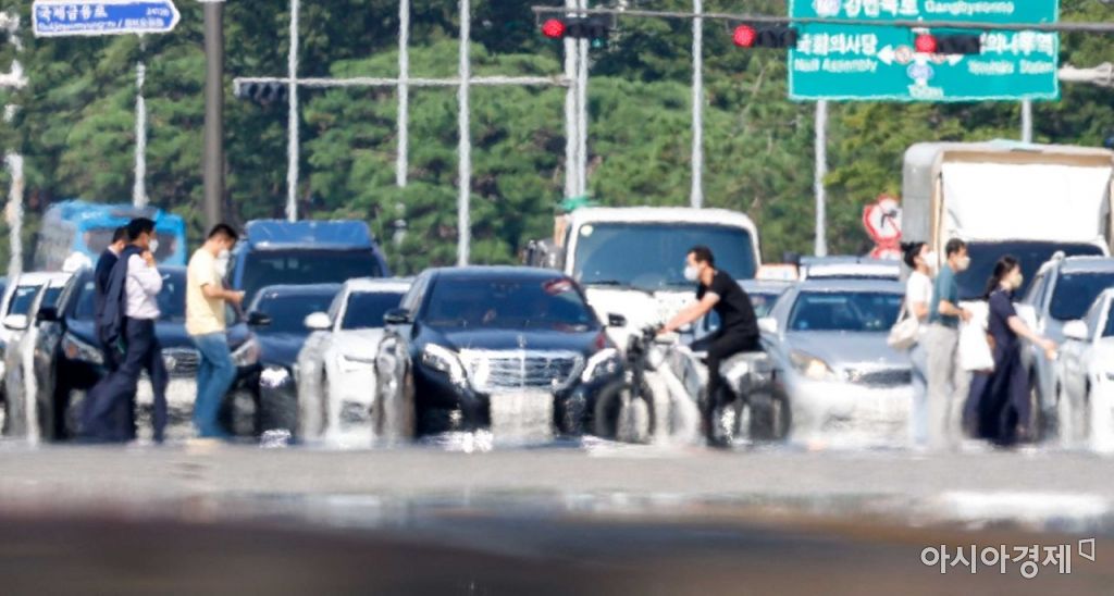 수도권을 휩쓸었던 폭우가 소강상태로 접어든 12일 서울 여의도대로에서 아지랑이가 피어오르고 있다./강진형 기자aymsdream@