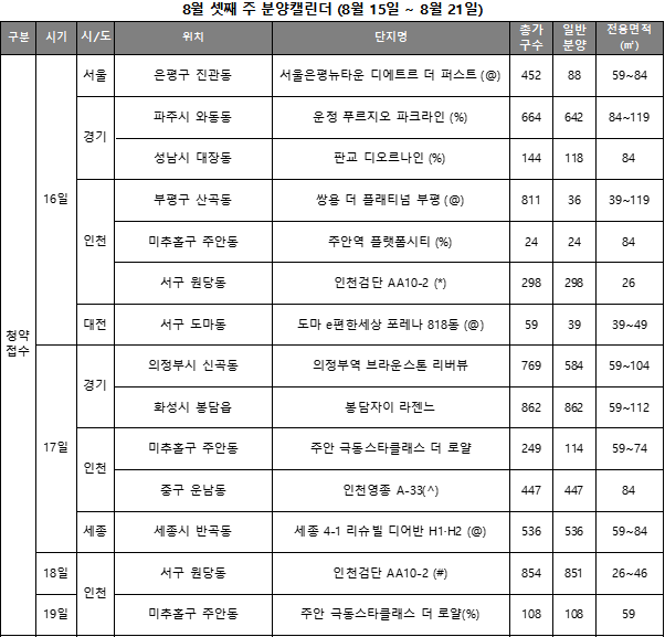 [아시아경제 황서율 기자] 8월 셋째 주 전국 14곳에서 분양이 이뤄지는 가운데 전체 물량 중 약 88%가 수도권에 집중됐다.