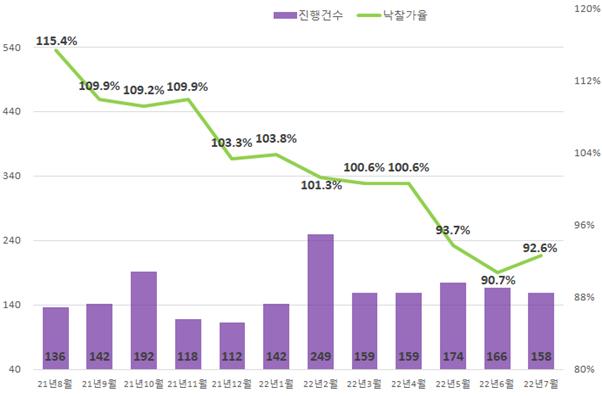 특히 경기는 지난달 주거시설 중 아파트에서도 2억원 미만에 수요가 몰리면서 아파트 낙찰가율이 소폭 반등하는 모습이다. 경기 아파트 낙찰가율은 지난 5월 93.7%로 전월 대비 6.9%포인트 급락한 이후 6월도 90.7%로 하락했다. 그러나 지난달 92.6%로 전월 대비 1.9%포인트 소폭 상승했다.
