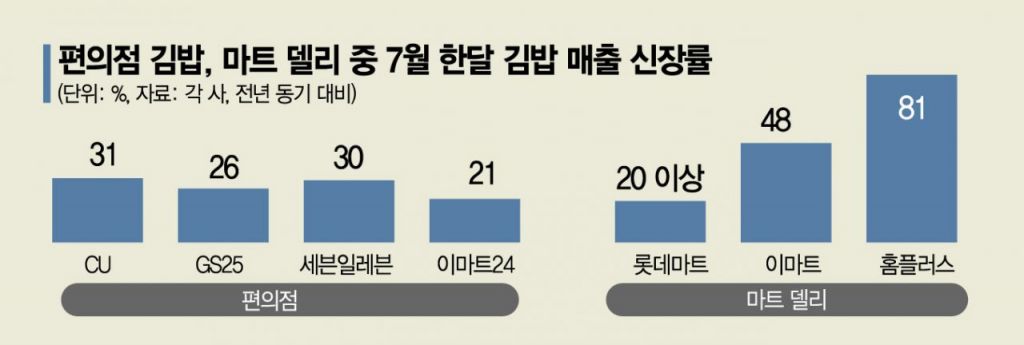 마트 업계도 마찬가지 신장세를 보였다. 김밥 만들기 재료나 델리 중 김밥이 차지하는 매출이 늘어난 것이다. 롯데마트에 따르면 7월 한 달 델리 중 김밥 매출은 전년대비 20% 이상 신장했고, 김, 단무지, 어묵, 햄 등 김밥 식재료의 매출도 같은 기간 10% 이상 늘었다. 마찬가지로 이마트 김밥·롤은 48% 신장했고, 같은 기간 홈플러스도 델리 중 김밥 매출이 81%로 뛰었다.