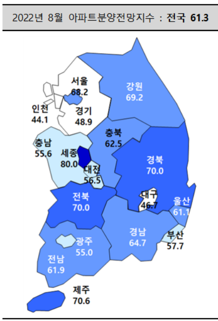 지방 광역시는 모두 하락 전망이 나타나면서 지난달 68.6포인트에서 약 9포인트 하락한 59.5로 집계됐다. 부산(57.7)은 전월 대비 11.5포인트, 대전(56.5)은 11.9포인트, 광주(55.0)는 18.7포인트 하락했다. 대구(46.7)는 지난달 60.0에서 13.3포인트 감소하며 40선에 접어들었다.