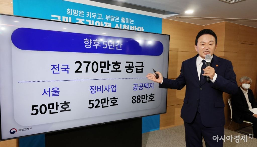 원희룡 국토교통부 장관이 16일 서울 종로구 정부서울청사에서 윤석열 정부 첫 주택공급대책을 발표하고 있다./김현민 기자 kimhyun81@