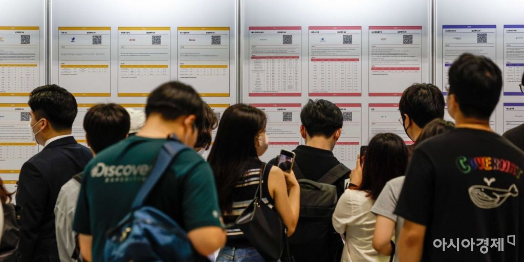 지난 7월5일 서울 강남구 코엑스에서 열린 '중견기업 일자리박람회'에 참가한 구직자들이 채용게시판을 보고 있다./강진형 기자aymsdream@