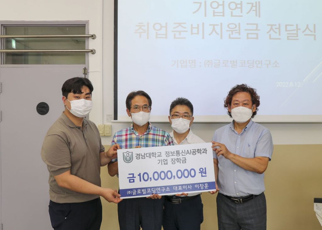[아시아경제 영남취재본부 송종구 기자] 경남대학교 정보통신AI공학과는 지난 12일 제5공학관에서 글로벌코딩연구소로부터 ‘기업연계 취업 준비 지원금’ 1000만원을 전달받았다.