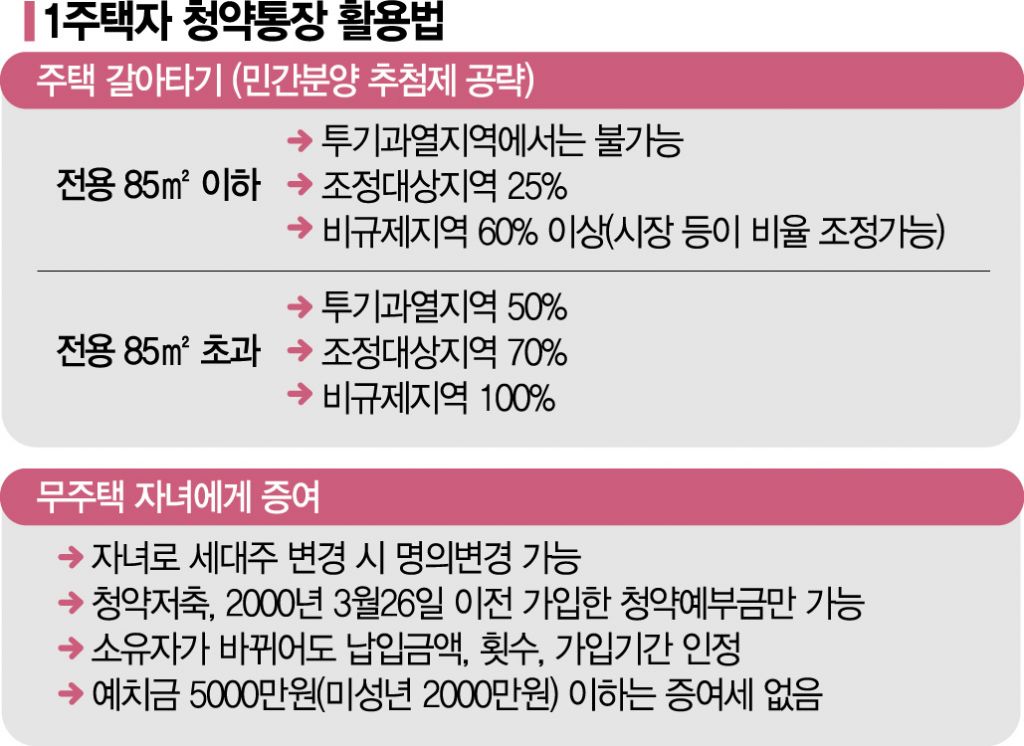 민간분양 청약물량 중 가장 많은 비중을 차지하는 것은 가점제 물량이다. 기준에 따른 합산 점수가 높을수록 당첨 확률도 높아지는데 이 중 하나가 청약통장 가입기간이다. 청약통장 가입기간이 15년 이상이 지나면 17점 만점을 받을 수 있는데, 이는 전체 만점(84점)에서도 비중이 적지 않다. 유주택자가 집을 팔게되면 가장 배점이 높은 무주택기간은 0점부터 다시 시작해야 하는데, 청약통장이 유지되고 있다면 최소한 이를 상쇄시킬 수 있는 셈이다.