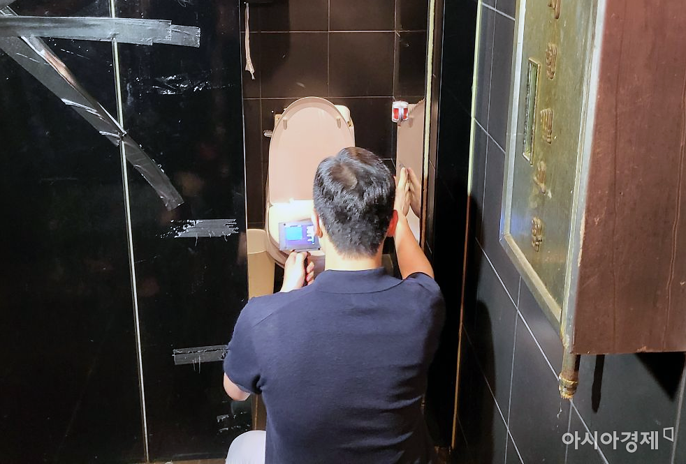 같은 시간 마포경찰서 여성청소년과 소속 경찰관 2명은 클럽 내 남·여화장실에 들어가 양변기 아래쪽을 살피고 있었다. 칸막이 벽면에 나사나 작은 구멍들이 있는지 확인하고 준비한 장비를 꺼내 들었다. 이는 적외선 카메라로 카메라 렌즈에서 나오는 적외선을 감지해 카메라가 숨겨져 있는지 여부를 확인할 수 있다. 적외선이 나오는 곳은 전자파 감지장치를 통해 확인도 해봤다. 그 결과 불법촬영 카메라는 발견되지 않았다. 경찰관은 점주에게 “카메라를 숨길만한 휴지통의 경우 옆으로 옮기는 게 안전하다”라며 불법촬영 예방하는 방법을 설명했다.