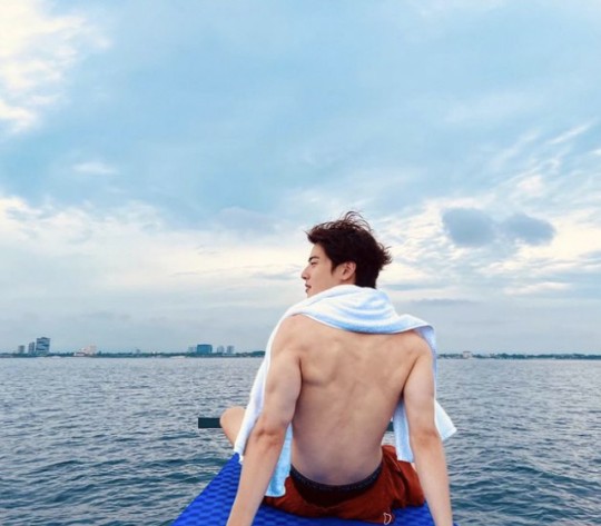공개된 사진 속 차은우는 푸른 바다를 배경으로 수영복을 입고 성난 등근육을 뽐내 눈길을 끌었다.