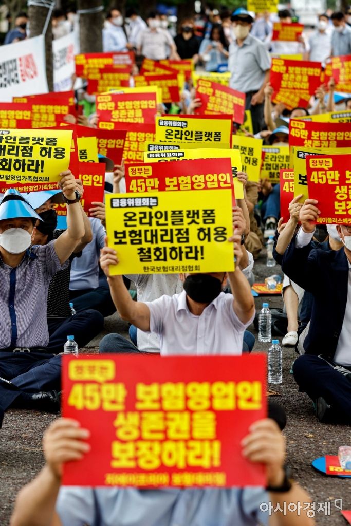 22일 서울 용산구 대통령집무실 인근에서 보험대리점 소속 관계자들이 온라인플랫폼 보험대리점 진출 저지 및 보험영업 생존권 사수 위한 결의대회를 하고 있다./강진형 기자aymsdream@