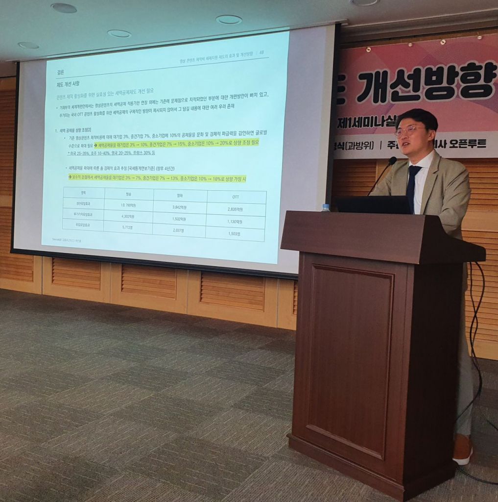 백승일 한국방송채널진흥협회 사무처장은 "K콘텐츠 글로벌화가 진행되면서 세계 시청자의 눈 높이에 맞는 작품으로 세계적인 기업들과 경쟁을 펼쳐야 하지만 치솟는 제작비를 감당하기 어려운 재원구조"라며 "영상콘텐츠 제작비 세액공제율 상향이 신작이나 차기 시즌에 대한 재투자로 이어지는 선순환이 이뤄진다면 대한민국 콘텐츠 산업 활성화의 마중물 역할을 할 것"이라고 말했다.