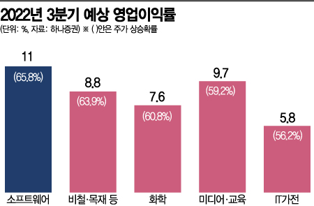 하나증권은 구체적으로 올해 2분기 대비 3분기 영업이익률의 개선이 기대되고, 과거 영업이익률 개선 상황에서 주가수익률과 상승 확률이 높았던 업종에 주목해야 한다고 분석했다. 이들 종목이 3분기 실적 발표 즈음에는 주가 상승의 기회가 있을 것이라고 예상했다. 이에 해당하는 업종으로는 화학, IT가전, 비철·목재, 소프트웨어, 미디어·교육 등을 제시했다. 이들 중 소프트웨어(65.8%), 비철·목재(63.9%), 화학(60.8%) 등의 주가상승 확률이 있다고 내다봤다.