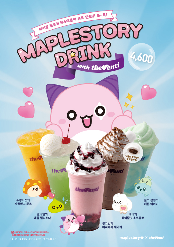 [아시아경제 문혜원 기자]더벤티는 넥슨의 인기 온라인 게임 ‘메이플스토리’와 협업한 신메뉴 ‘메이플스토리 드링크’ 5종을 출시했다고 26일 밝혔다.