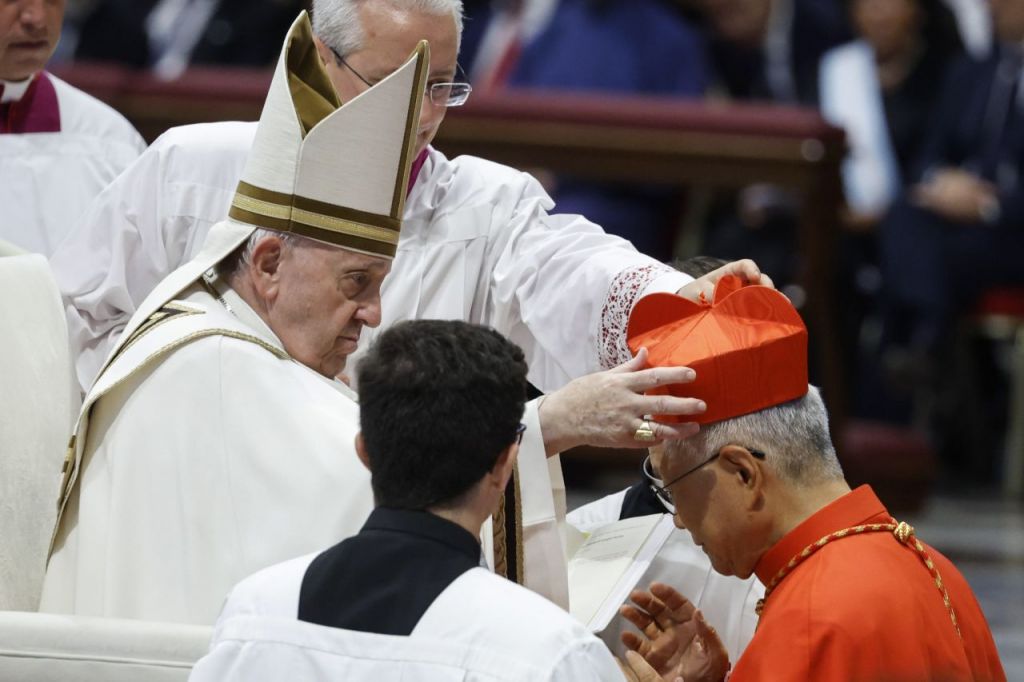 새로 서임된 추기경들은 신앙 선서와 충성 서약 뒤 빨간색 사제 각모(비레타)와 추기경 반지를 받았다. 추기경 품위의 상징인 비레타는 아래는 사각형이고 위쪽에 성부·성자·성령의 삼위(三位)를 상징하는 세 개의 각이 있다. 빨간색은 순교자의 피를 상징, 교회의 성장과 자유를 수호하기 위해 투신해야 함을 의미한다.