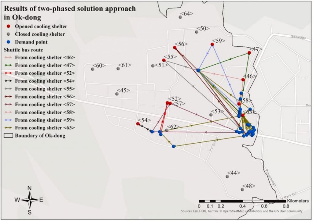 이 방법을 이용하면 폭염 취약계층의 위치와 무더위쉼터의 수용인원을 모두 고려한 입지와 사람들의 이동을 위한 최적의 셔틀버스 운행경로도 함께 얻을 수 있다.