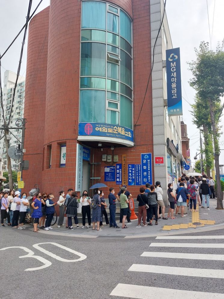 지난 7월 12일 오전 9시 서울 영등포구 대림동 새마을금고 앞에서 적금을 들기 위해 고객들이 대기하고 있다.