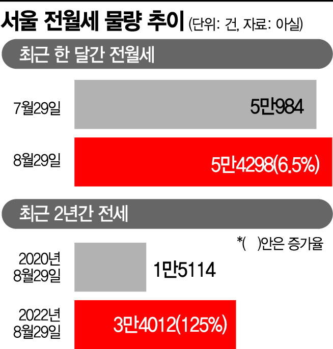 29일 부동산 빅데이터 업체 아실에 따르면 이날 기준 서울 아파트 전·월세 물건은 총 5만4298건으로 한 달 전보다 6.5% 증가했다. 제주(19.6%), 광주광역시(8.7%), 경기(6.7%)에 이어 전국에서 4번째로 증가폭이 크다. 부산(5.6%)과 인천(4.3%), 대구(4.0%) 등 수도권과 주요 지방 광역시의 물건도 한 달 전과 비교해 전·월세 물건이 늘었다. 임대차2법 시행 2년 차를 맞이해 전세 대란이 일어날 것이라는 일각의 예상과는 달리 매물 수만 놓고 보면 2020년 8월 이전 상황으로 회귀한 것이다. 순수 전세 물건의 경우 2년 전 1만5114건에서 3만4012건으로 125% 증가한 것으로 나타났다.