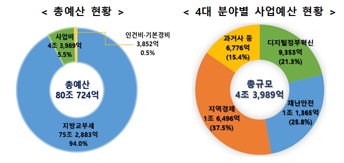 사업예산은 디지털플랫폼정부 구현, 선진화된 재난안전 관리체계 구축, 지역균형발전 인프라 강화 등 새 정부 핵심 국정과제에 중점을 두고 4조 3989억원을 투입한다. 행안부는 우선 디지털플랫폼정부 구현을 위해 9535억원을 투입해 국민비서 서비스와 모바일 신분증을 확대하고, 마이AI서비스·Any-ID·데이터플랫폼 등을 구축한다.
