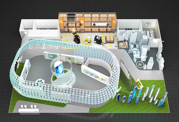 이번 전시의 핵심 중 하나인 'H₂ Warehouse'는 친환경 수소물류센터의 모습을 그대로 재현해 놨다. 지난 4월 두산밥캣과의 업무협약 이후 연구 개발돼 최초로 공개한 수소 지게차를 포함하여 파트너사인 플러그파워의 차량용 수소연료전지, 수소충전기 등을 전시한다. 오염 물질이 전혀 배출되지 않는 친환경 수소 물류센터는 미국 캘리포니아 등에 이미 상용화 되어 있으며, 국내 물류업계에도 확산될 것으로 예상된다.
