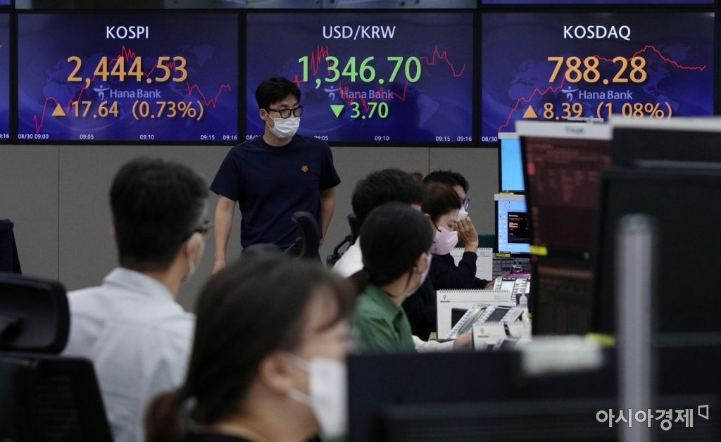 코스피가 전 거래일보다 14.32포인트(0.59%) 오른 2441.21에 장을 연 30일 서울 중구 하나은행 딜링룸 모습. 서울 외환시장에서 원·달러 환율은 4.4원 내린 1346.0원에 출발했다./김현민 기자 kimhyun81@