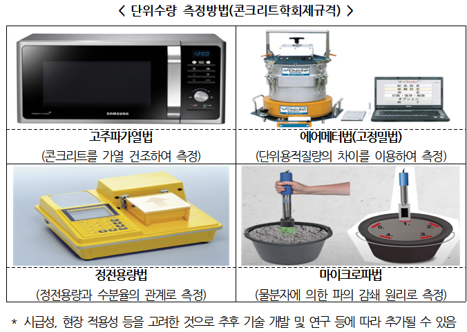 단위수량 품질검사 기준에는 시험·검사 방법, 검사 시기 및 횟수, 판정기준을 구체적으로 담아 신뢰성 있는 검사가 가능하도록 하였으며, 특히 시공자가 현장여건에 따라 다양한 시험방법 중 한 가지를 선택할 수 있도록 하여 편리한 검사가 가능하도록 했다.