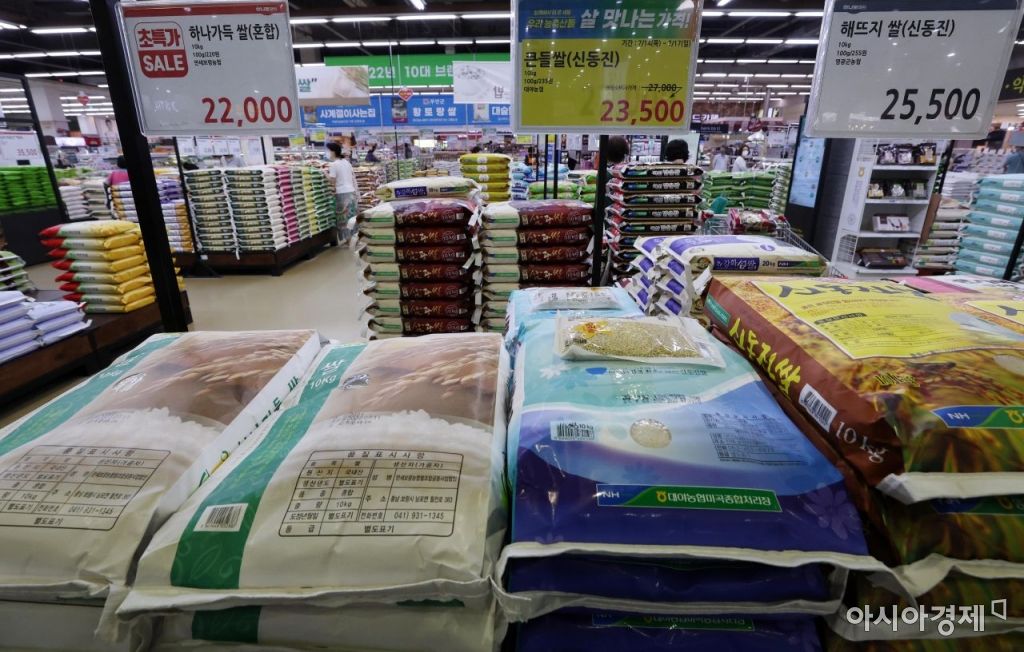식품 물가가 하루가 다르게 오르는 요즘 외려 한국인의 '주곡'(主穀)인 쌀값이 계속 떨어지고 있다. 지난해 10월 이후 지속해서 하락한 산지 쌀값은 현재 평년보다 낮은 수준이다. 쌀 농가는 고물가에 소득 감소까지 '이중고'를 겪고 있다. 사진은 서울의 한 대형마트의 쌀 판매대 모습./김현민 기자 kimhyun81@