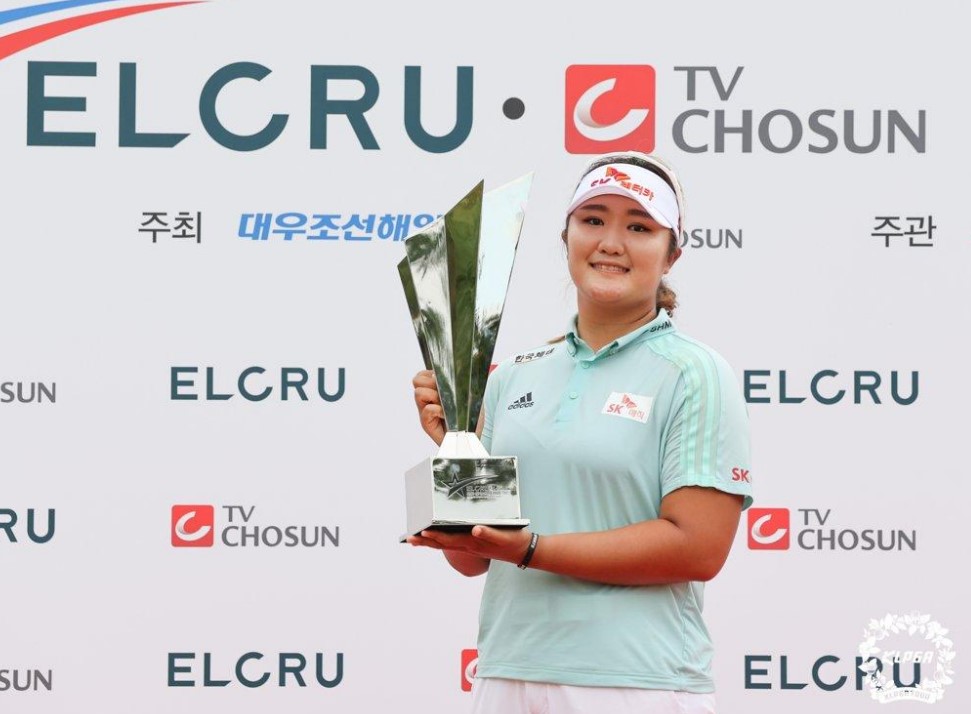 KLPGA투어 엘크루 프로 셀러브리티 대회가 개막을 앞두고 취소됐다. 지난해 유해란이 우승 직후 트로피를 들고 있는 모습이다. [사진제공=KLPGA]
