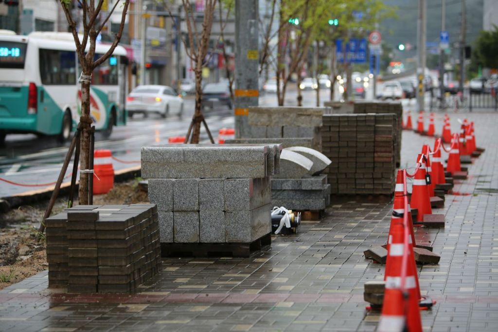 작업이 멈춘 현장엔 지난 2일 저녁 기준 보도블록, 벽돌 등 자재가 인도 곳곳에 쌓여있었다.