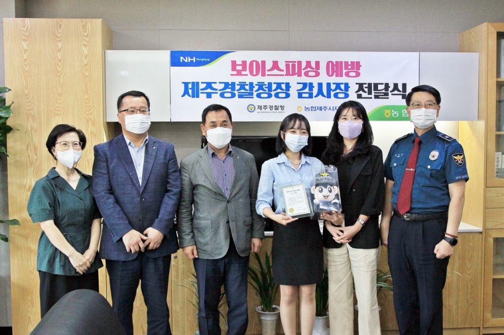 감사장을 받은 농협은행 제주시지부 이모 계장은 지난달 25일 고객이 타 금융기관에서 대출을 받기 위해 인증서를 발급하려고 하자 이상함을 감지하고 고객에게서 구체적인 상황을 파악한 후 인증서 발급 절차를 중단했고 최근 발생하고 있는 전화금융사기 사례를 안내하는 등 고객이 사기를 당하고 있음을 설득했다.