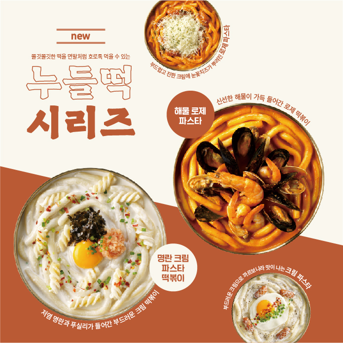 신메뉴는 누들 떡볶이 4종으로 로제떡볶이, 해물로제떡볶이, 크림떡볶이, 명란크림파스타떡볶이가 출시된다. 해물로제떡볶이는 신선한 해물이 가득 들어가 로제떡볶이의 풍미를 돋구는 메뉴이며, 명란크림파스타떡볶이는 저염 명란과 푸실리가 들어간 부드러운 프리미엄 떡볶이 메뉴다.