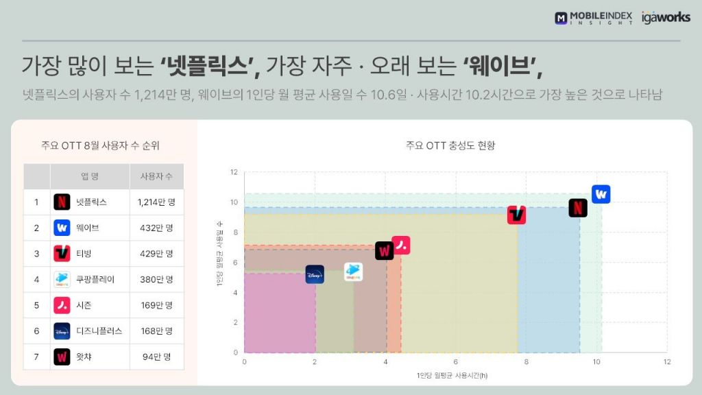 합병을 앞둔 티빙과 시즌의(중복 제외) 8월 사용자 수는 561만6405명으로, 주요 국내 OTT 8월 사용자 수 1위에 올랐다. 웨이브의 8월 MAU는 432만3469명이었다. 다만 1인당 월평균 사용일 수 및 사용 시간은 웨이브가 각각 10.6일, 10.16시간으로 가장 높았다.