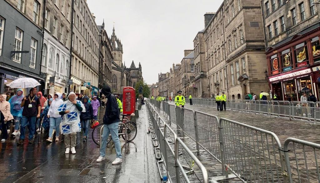 경찰이 지난 11일(현지시간) 영국 스코틀랜드 에든버러에서 여왕 첫 장례 행렬을 앞두고 도로를 통제하고 있다. [이미지출처=연합뉴스]