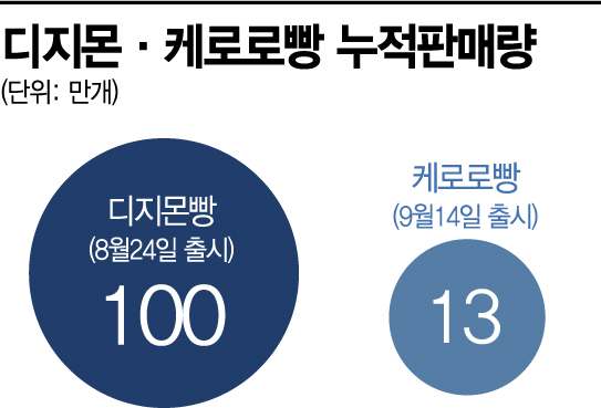 21일 롯데제과에 따르면 지난달 24일 출시된 디지몬빵은 누적 판매량 100만개를 돌파했다. 이달 14일 나온 케로로빵도 5일만에 13만개가 팔리며 품귀 현상을 빚고 있다.