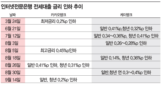 케이뱅크는 지난 7월 전세대출의 금리를 연 0.34~0.36%P(청년 연 0.41%P) 인하했고, 지난달 3일에도 전세대출의 금리를 0.26~0.28%P를 추가로 내렸다. 케이뱅크가 두 차례 금리를 낮추자 카카오뱅크 역시 이틀 뒤인 지난달 5일 전월세보증금대출 최고금리를 0.45%P 인하했다. 케이뱅크는 이로부터 2주 뒤인 지난달 18일 전세대출의 금리를 0.14%P(청년 연 0.36%P) 낮췄고, 이를 본 카카오뱅크는 지난달 26일 다시 전월세보증금대출 금리를 0.41%P, 청년전월세보증금대출 금리를 0.31%P 인하했다. 케이뱅크는 지난달 30일 다시 일반·청년 전세대출의 금리를 0.3~0.4%P 낮췄다.