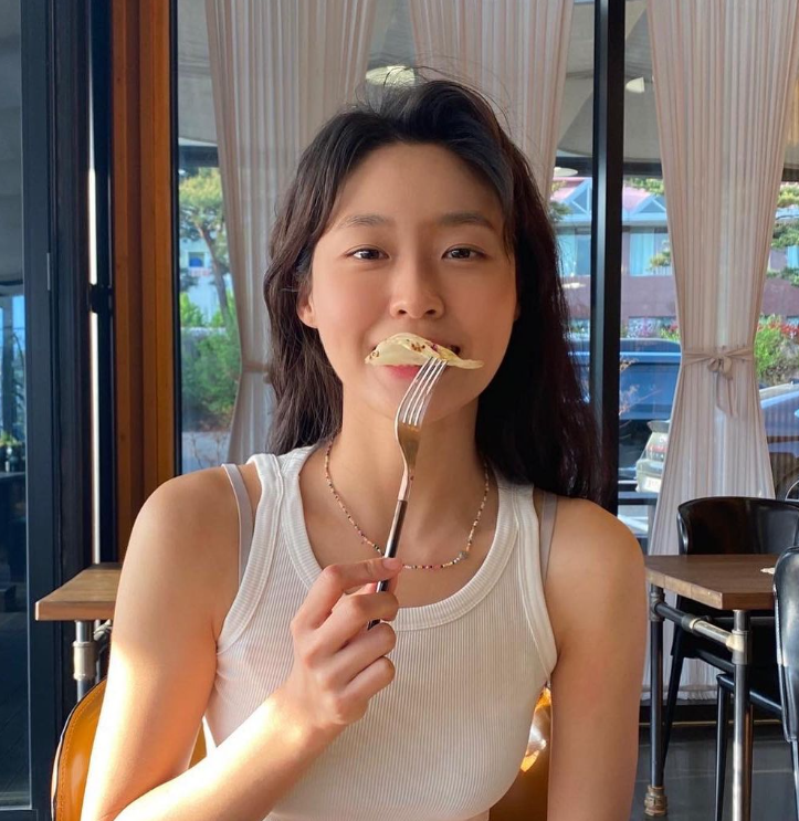 사진 속 설현은 샐러드를 입에 대고 카메라 앞에서 포즈를 취하고 있다.