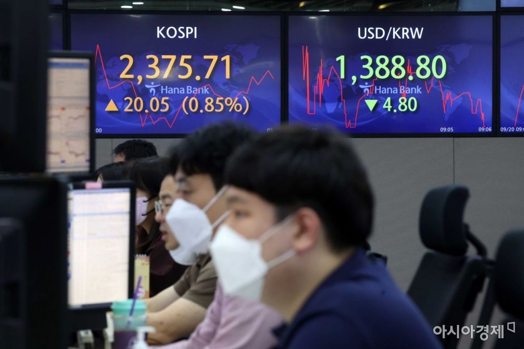 20일 서울 을지로 하나은행 딜링룸에서 딜러들이 일하고 있다. 이날 코스피 지수는 전 거래일 대비 17.98포인트(0.76%) 상승한 2373.64에 출발했다. 원·달러 환율은 3.6원 내린 1390.0에 개장했다. /문호남 기자 munonam@