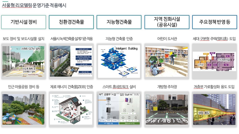 구체적으로 보면 그간의 정책변화 등을 반영해 단지 내 충분한 주민공동시설을 확보하고, 지역사회와 공유하는 한편 친환경 건축 설계를 유도하고 있다. 담장 허물기, 키움센터, 어린이 놀이터 등 커뮤니티 시설을 추가 확보하고 지역에 공유할 경우 용적률이 완화된다. 제로 에너지 빌딩(ZEB)이나 전기차 충전시설 설치 및 지역공유, 신재생에너지 활용 등 친환경 정책을 반영할 경우에도 마찬가지다.