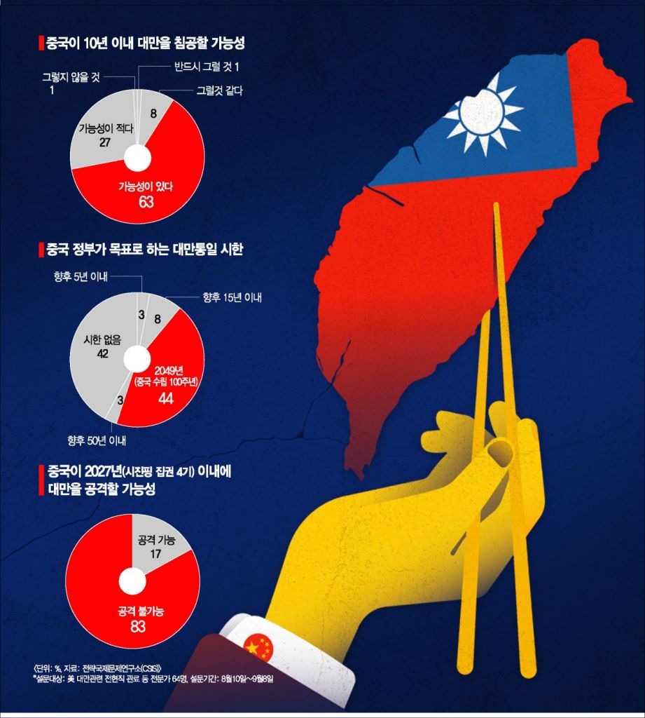 미국의 싱크탱크인 전략국제문제연구소(CSIS)는 지난달 10일부터 이달 8일까지 미국 내 대만 문제 관련 전·현직 관료 등 전문가 64명을 대상으로 중국의 대만 침공을 주제로 설문조사를 실시했다. 중국이 향후 10년 이내에 대만에 대한 상륙작전을 전개해 침공할 가능성이 있느냐는 질문에 63%가 "가능성이 있다"고 답했다. "그럴 것 같다(8%)" "반드시 그럴 것(1%)"을 합치면 전체 응답자의 72%가 10년 내 대만 침공 가능성을 높게 본 것이다.