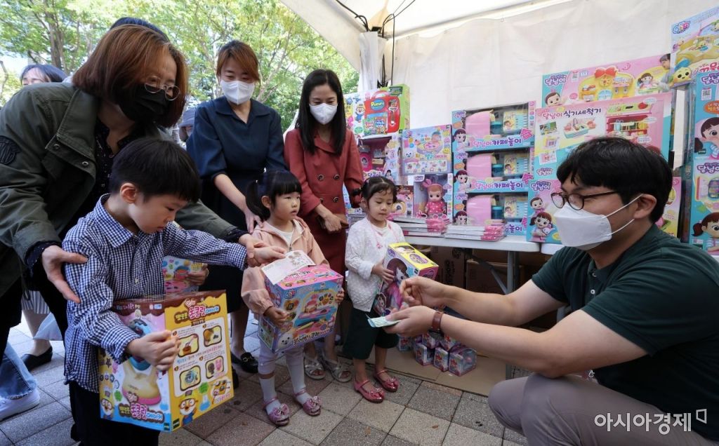 23일 서울 서초구청 앞마당에서 열린 '나눔과 회복의 서리풀 바자회'를 찾은 부모와 아이들이 장난감을 구매하고 있다. 이번 행사의 수익금은 지난달 기록적인 폭우로 피해를 입은 주민들에게 기부된다./김현민 기자 kimhyun81@