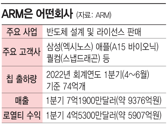 ARM은 컴퓨터의 CPU와 스마트폰 두뇌로 불리는 AP칩 설계도를 제공하고 그에 대한 라이선스(수수료) 비용을 받아 수익을 얻는 회사다. 삼성전자는 물론 애플, 퀄컴 등의 주요 반도체 기업이 모두 ARM 설계도를 구매해 자체 규격에 맞게 변경하고 있으며, 전 세계 스마트폰의 95%가 ARM이 설계한 반도체 IP를 사용한다. 세계 각국에서 500개가 넘는 반도체 업체들이 ARM의 반도체 설계자산(IP)을 도입하고 있을 정도다. 현재까지 ARM 디자인을 기반으로 약 2300억 개 이상의 칩이 만들어졌으며, 지난해 기준 ARM의 기술 로열티 수익은 전년보다 20.1% 증가했다. 삼성전자를 비롯해 인텔, 퀄컴, SK하이닉스 등이 ARM에 눈독을 들이는 배경이다.