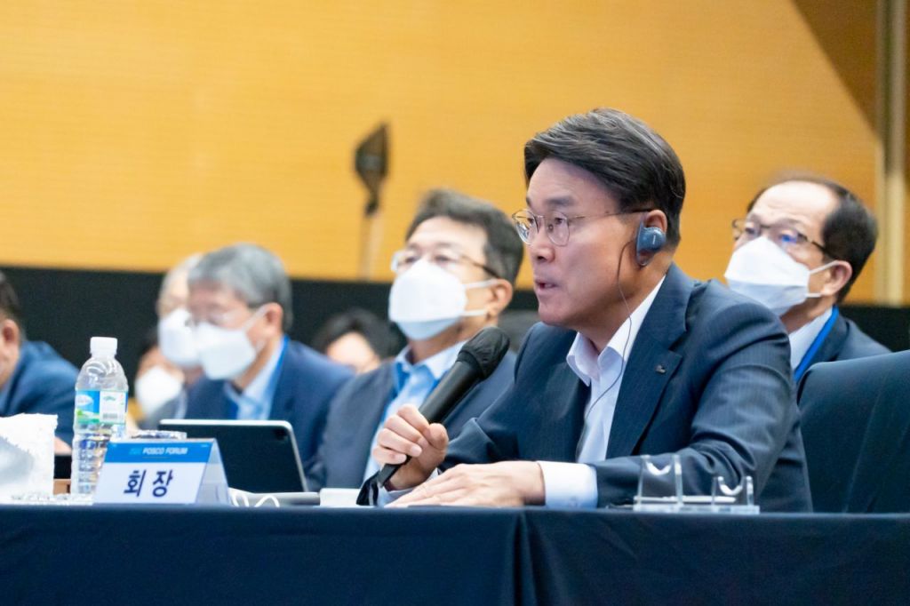 최정우 포스코그룹 회장이 지난달 30일 포스코인재창조원에서 열린 '2022 포스코포럼'에서 배리 아이켄그린 미 UC버클리 경제학과 교수와 영상 토론을 하는 모습. 사진제공=포스코그룹