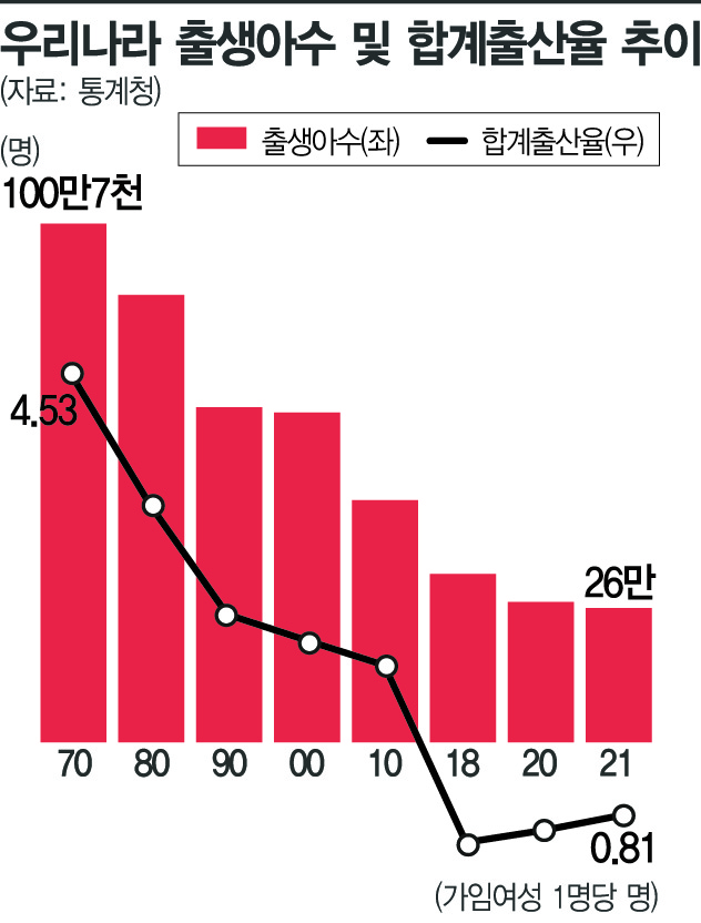 [아시아경제 세종=권해영 기자] 정부가 지난 20년간 저출산 대책에 수백조원을 쏟아부었지만 출산율이 수직낙하하고 있다. 여성 1명이 평생 낳을 것으로 예상되는 자녀 수인 합계출산율은 0.81명으로 경제협력개발기구(OECD) 꼴찌다. 영국 옥스퍼드대학 인구문제연구소는 지구 상에서 제일 먼저 소멸할 국가로 우리나라를 꼽았다. 한국은 어쩌다 출산율 세계 꼴찌가 됐을까.
