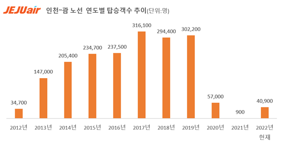 인천~괌 노선 탑승객은 취항 첫해인 2012년 3만4700여명에서 2년 만인 2014년에 20만명을, 2017년에는 30만명을 넘어섰다. 코로나19 이전인 2019년에도 30만2200여명이 탑승했으나 코로나19 여파로 지난해에는 거의 운항을 하지 않으면서 탑승객이 900여명에 그쳤다.