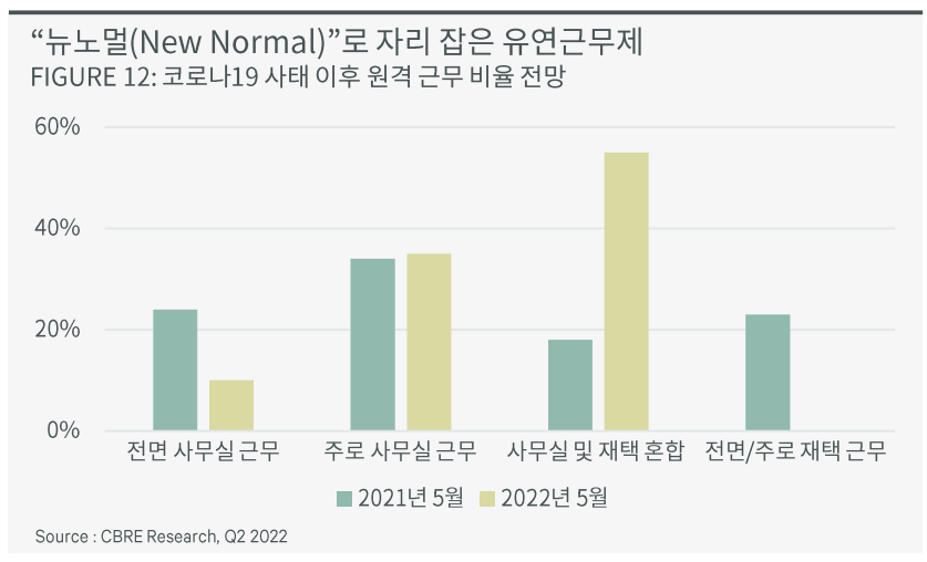 기업들은 최근 2년간 정부 방침에 따라 유연근무제를 도입·확대했다. 보고서는 "이제 엔데믹(감염병의 풍토병화) 국면을 맞아 기업들이 재택근무 비중을 조절하는 추세"라며 "앞으로는 사무실이 직원의 업무 특성에 맞추어 능동적인 활동 기반 업무 환경과 회합에 특화된 공간으로 점차 변화할 것"이라고 말했다.