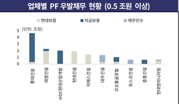 KR은 PF 우발채무 규모와 질적 리스크를 종합할 때 롯데건설, 코오롱글로벌, 태영건설 등은 모니터링이 필요하다고 강조했다. 롯데건설의 경우 다수의 프로젝트를 진행하며 상당수가 미착공사업으로 구성되어 있고 만기 구조가 단기화돼 있다. 코오롱글로벌은 위험지역 분포 비중이 높은 수준이다. 신용보강 제공 규모가 큰 단일 프로젝트의 사업 성과에 대한 모니터링이 필요하다는 지적이다. 태영건설은 만기 구조가 장기화돼 있으나, 상대적으로 미착공 및 비주거용 건물 비중이 높은 수준이다.