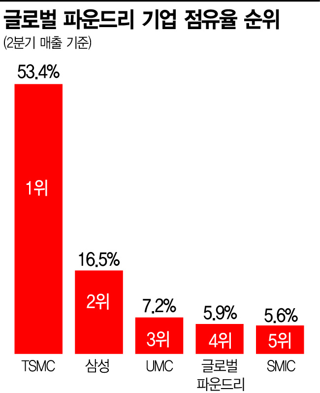 29일 반도체업계에 따르면 올해 2분기 파운드리 매출 기준 글로벌 시장 점유율은 1위가 대만 TSMC(53.4%), 2위가 삼성전자(16.5%)다. 1, 2위 간 점유율 격차가 1분기보다 0.4%포인트 줄어들기는 했지만, 여전히 격차는 크다. 일각에서는 이번 2분기 성적표에 삼성전자가 업계 최초로 양산에 들어간 3나노 공정의 매출 기여가 포함되지 않았다는 점에 주목하며 삼성전자와 TSMC의 3나노 이하 공정 고객 확보 효과가 본격적으로 드러나는 내년께 양사의 점유율 차이를 눈여겨봐야 한다는 목소리도 나오고 있다.