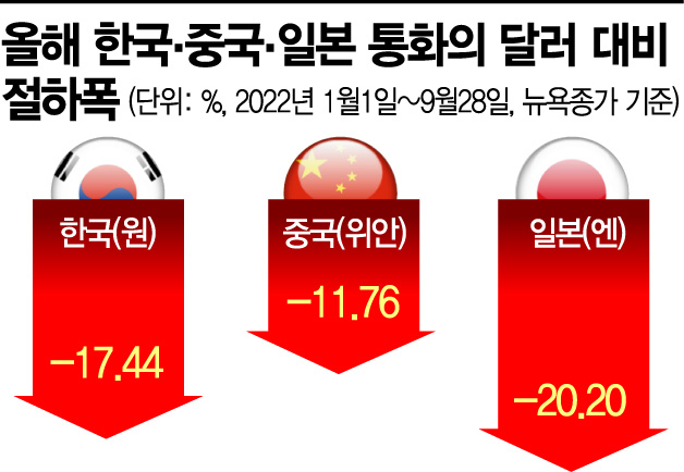 29일 금융시장에 따르면 달러화의 초강세가 이어지는 가운데, 아시아 주요국의 통화가치 하락세는 더욱 가팔라지고 있다. 올해 들어 일본 엔화는 전날까지 달러 대비 20.20%, 중국 위안화는 11.76% 하락했다. 최근 중국 역내에서 거래되는 위안·달러 환율은 2008년 2월 이후 처음 7.2위안을 돌파했고, 일본은행(BOJ)은 엔화가 달러당 145엔선을 넘어서자 24년 만에 시장에 개입했다.