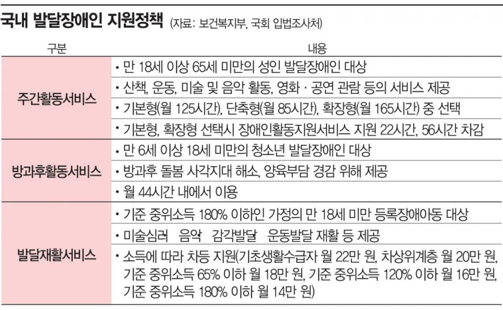 30일 국회 입법조사처의 '발달장애인 지원정책과 개선방향'에 따르면 만18세 미만 등록장애아동을 대상으로 한 대표 지원정책인 발달재활서비스는 소득에 따라 차등 제공된다. 그마저도 가장 혜택이 많다는 기초생활수급자가 월 22만원을 받고, 차상위계층은 20만원, 기준 중위소득 65% 이하는 매달 18만원을 받는다. 중위소득 180% 이하는 월 14만원에 그친다. 발달재활서비스는 언어, 미술, 음악, 감각발달, 운동발달 등을 제공해 인기가 높다.