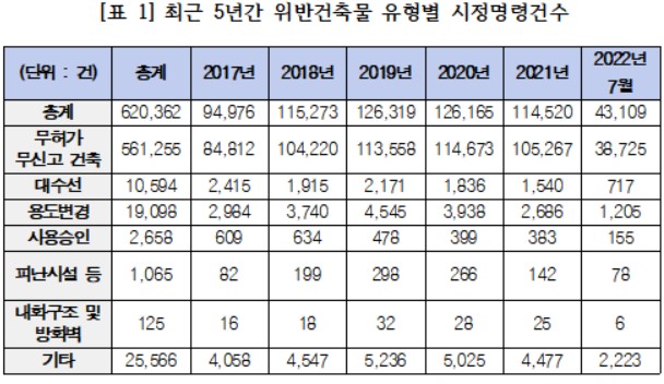 위반유형별로 살펴보면 무허가·무신고 건축이 총 56만1255건으로 90%가량을 차지했고, 용도변경(1만9098건), 대수선(1만594건) 순이었다.