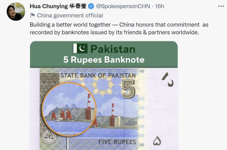 [아시아경제 베이징=김현정 특파원] '중국의 입'으로 불리는 외교부 대변인이 국경절에 파키스탄, 스리랑카, 태국 등 외국 지폐 사진을 잇달아 자신의 사회관계망서비스(SNS)에 올려 눈길을 끌고 있다. 해당 지폐에는 중국이 투자해 건설된 현지 사회기반시설(SOC)이 그려져있다는 공통점이 있다.